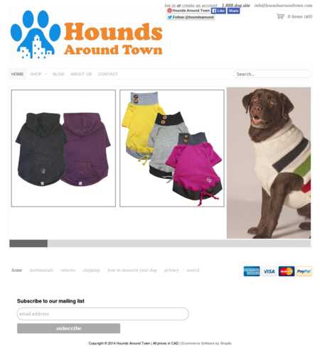 Hounds Around Town is an online only fashion retailer that caters to a very unique clientele--dogs. Founded by Angela Granchelli, the site offers high quality Canadian-made coats, sweaters, beds, and toys for dogs. They even have doggie boots, perfect for those walks on extra cold winter days. The clothing and other items offered by the site are hand selected for quality in materials and workmanship. The site also features a dog-owners blog, and offers prospective customers ideas for improving the well-being of man's best friend.