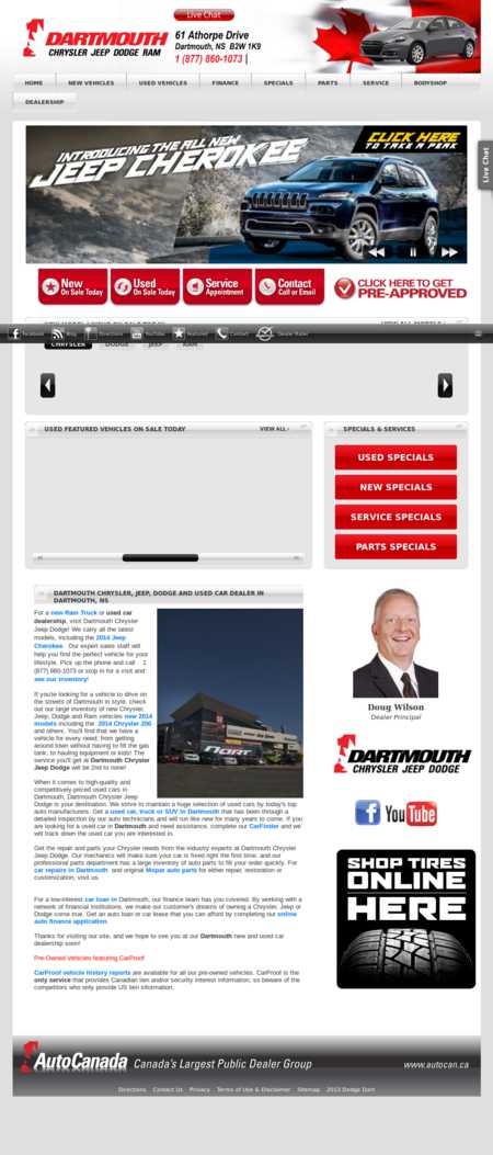 Dartmouth Chrysler Jeep Dodge is the premier place in Dartmouth, Nova Scotia (Canada) to find a huge selection of new and used vehicles. The dealership boasts a certified Chrysler Five Star rating and is committed to customer satisfaction. They carry the latest models of Jeep, Dodge and Ram vehicles, as well as used cars, trucks and SUVs to suit all budgets. They also provide car repairs and original Mopar auto parts. Call or visit today!
