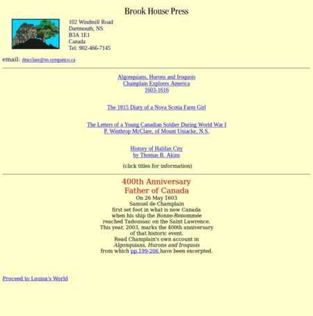 The Brook House Press is a house in Dartmouth, NS that dedicates and focuses itself on printing various books. They offer a variety of printings like "The 1815 Diary of a Nova Scotia Farm Girl" amongst others. The website provides a larger sample of the printings they the Brook House Press provides. In addition to this, the website provides the user with an address, phone number, and other valuable contact information to keep in touch with them.