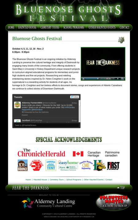 Supported by the Alderney Landing Community Cultural Centre, the Bluenose Ghosts Festival is an ongoing project to preserve the cultural integrity and heritage of Dartmouth by engaging students in a variety of interesting projects and promoting entertaining as well as learning about the community. Stories inspired by Dr. Helen Creighton's work will fascinate those of all ages and research projects will capture the imagination of all involved. Call or go online for more info, or to see about scheduling a tour.