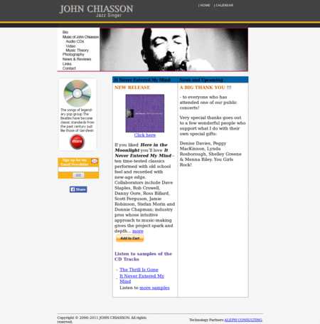 John Chiasson is a Canadian jazz vocalist who began his recording career in 1997. Chiasson's vocal style is smooth, like the crooners of the post-war era through the 1960s. He has recorded material ranging from jazz and pop standards to crooning new takes on music from artists like The Beatles. In addition to his recording career, Chiasson is a constant, welcome presence performing in Canadian jazz clubs, working with only the most talented musicians in the field.