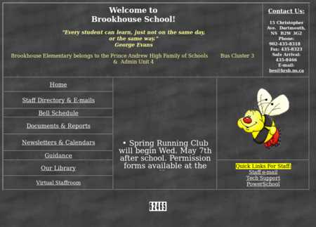 Brookhouse Elementary School, part of the Prince Andrew High family of schools, serves the Dartmouth, Nova Scotia (Canada) area for children up to and including Grade 6. The school opened in 1967 and currently enrolls over 350 students per year. The school website offers contact information, a staff directory, newsletters and event calendars, and access to the school library site and guidance department. There is also a scrolling news feed with upcoming events and the latest school information.
