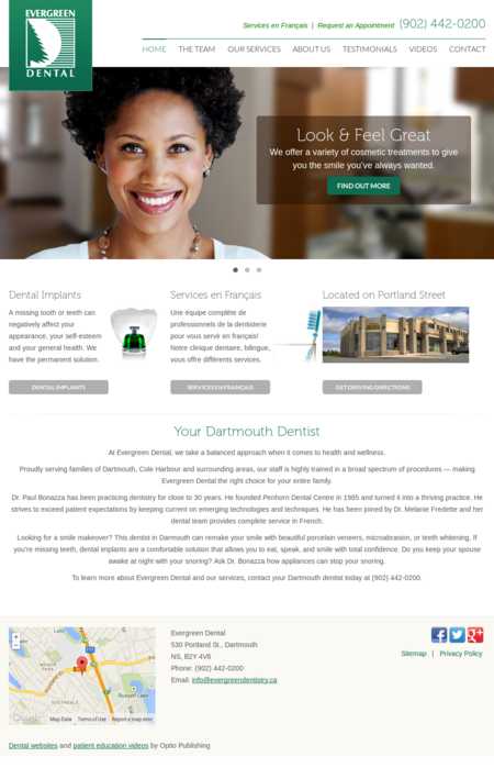 Evergreen Dental is a full service dental group practice in Dartmouth, Nova Scotia. They perform all standard dental procedures including cosmetic and restorative procedures. The practice offers modern treatments such as teeth whitening and implants, as well as treating patients with oral-related snoring problems and those who suffer from TMJ. The practice actively solicits new patients through testimonials and videos of the newest advances in dentistry as performed at the clinic. They pride themselves on painless, patient-friendly dentistry.